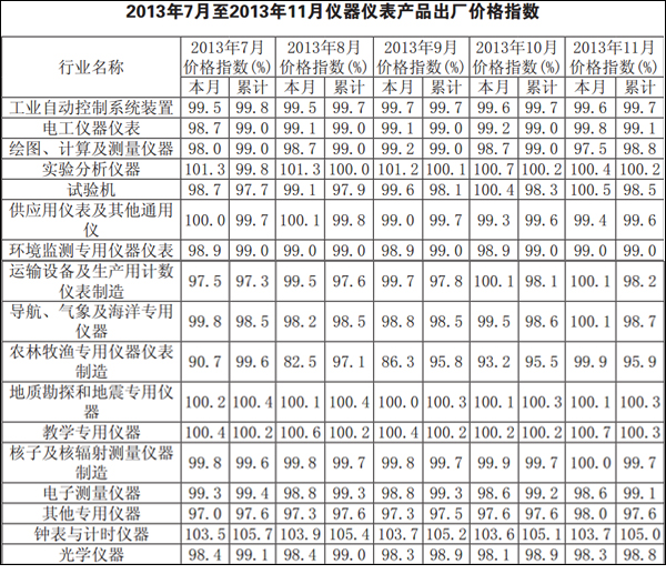 上海儀器儀表行業(yè)協(xié)會目前公布了2013年11月儀器儀表產品出廠價格指數(shù)。