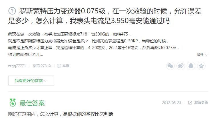 1、羅斯蒙特壓力變送器0.075級,在一次效驗的時候,允許誤差是多少,怎么計算,我表頭電流是3.950毫安能通過嗎(我現在做一次效驗,有手動加壓泵福祿克718一臺300G的,哈特475,就是不是羅斯蒙特壓力變松器允許誤差是多少,比如我的表量程是0-30KP,當零位的時候,電流是正負多少才算正常,我是這樣計算的,4-20毫安,20-4等于16毫安,然后再乘以0.075%,得到的就是0.01幾了啊,那我在零位的時候如果是3.988毫安,或者3.980那不都通不過啊,我記得以前這種小誤差都可以忽略不記得啊,請高人指點一二,急)