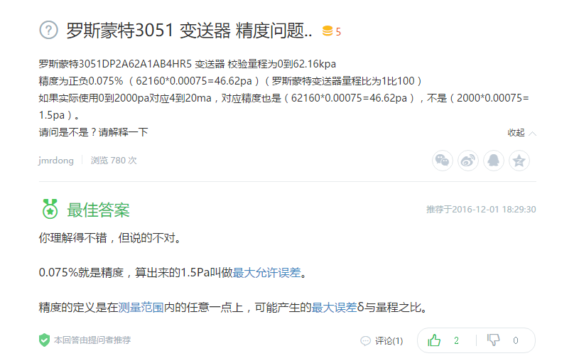 1、羅斯蒙特3051 變送器 精度問題(羅斯蒙特3051DP2A62A1AB4HR5 變送器 校驗量程為0到62.16kpa精度為正負0.075% (62160*0.00075=46.62pa)(羅斯蒙特變送器量程比為1比100)如果實際使用0到2000pa對應4到20ma,對應精度也是(62160*0.00075=46.62pa),不是(2000*0.00075=1.5pa)。請問是不是?請解釋一下)