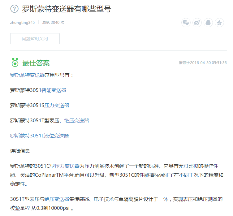 羅斯蒙特3051C壓力變送器 羅斯蒙特公司對產(chǎn)品非常成功的不斷技術(shù)改進.使得產(chǎn)品質(zhì)量一直保持世界第一.贏得了用戶的信任.中國客戶這樣來評價羅斯蒙特3051變送器:我們廠從七十年代末就開始使用羅斯蒙特的原裝3051變送器.是中國3051變送器最早的用戶之一.近二十年來,我們在很多裝置上不斷地購買使用3051變送器.從最早的由分立元件,三塊線路板組成精度為0.25%1151變送器到現(xiàn)在的只有一塊大規(guī)模多層集成電路精度為0.1%的智能3051.總共使用了近600臺2051和200臺3051變送器.我們完全看到了羅斯蒙特變送器在一步一步連續(xù)不斷的成功改進.在過去幾年中我們也使用過許多其他公司的產(chǎn)品.通過使用比較.我們最近已決定以后將主要考慮使用羅斯蒙特的2051和3051變送器.我們的體會是:除了精度,量程比等一些技術(shù)指標(biāo)以外羅斯蒙特壓力變送器在穩(wěn)定性,可靠性上有最突出的表現(xiàn).故障率極低.在抗雷電干撓沖擊方面.其他公司的變送器或多或少有損壞,但羅斯蒙特壓力變送器從來沒有發(fā)生過這種情況.我們對羅斯蒙特2051和3051變送器非常滿意。