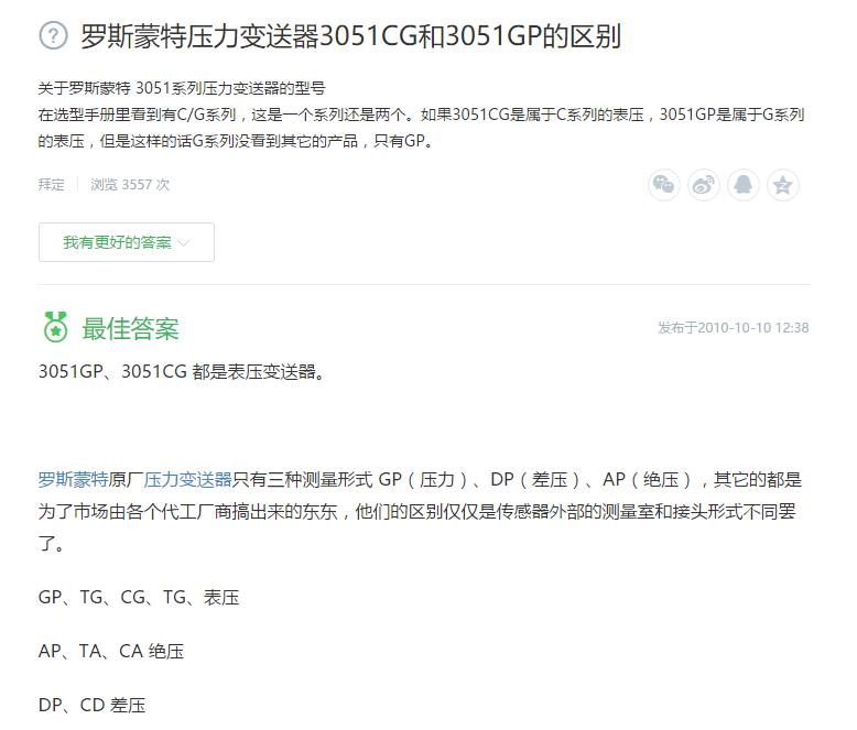 3051GP、3051CG 都是表壓變送器。 羅斯蒙特原廠壓力變送器只有三種測量形式 GP(壓力)、DP(差壓)、AP(絕壓),其它的都是為了市場由各個代工廠商搞出來的東東,他們的區別僅僅是傳感器外部的測量室和接頭形式不同罷了。GP、TG、CG、TG、表壓AP、TA、CA 絕壓DP、CD 差壓