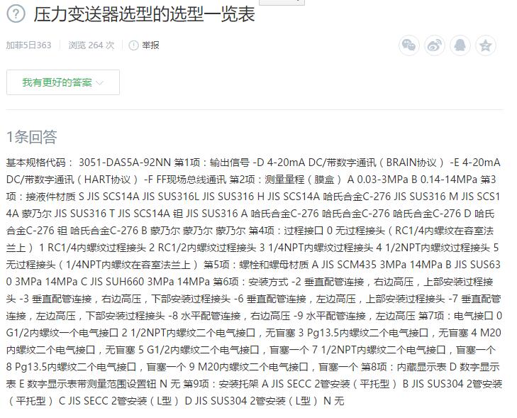 基本規格代碼: 3051-DAS5A-92NN 第1項:輸出信號 -D 4-20mA DC/帶數字通訊(BRAIN協議) -E 4-20mA DC/帶數字通訊(HART協議) -F FF現場總線通訊 第2項:測量量程(膜盒) A 0.03-3MPa B 0.14-14MPa 第3項:接液件材質 S JIS SCS14A JIS SUS316L JIS SUS316 H JIS SCS14A 哈氏合金C-276 JIS SUS316 M JIS SCS14A 蒙乃爾 JIS SUS316 T JIS SCS14A 鉭 JIS SUS316 A 哈氏合金C-276 哈氏合金C-276 哈氏合金C-276 D 哈氏合金C-276 鉭 哈氏合金C-276 B 蒙乃爾 蒙乃爾 蒙乃爾 第4項:過程接口 0 無過程接頭(RC1/4內螺紋在容室法蘭上) 1 RC1/4內螺紋過程接頭 2 RC1/2內螺紋過程接頭 3 1/4NPT內螺紋過程接頭 4 1/2NPT內螺紋過程接頭 5 無過程接頭(1/4NPT內螺紋在容室法蘭上) 第5項:螺栓和螺母材質 A JIS SCM435 3MPa 14MPa B JIS SUS630 3MPa 14MPa C JIS SUH660 3MPa 14MPa 第6項:安裝方式 -2 垂直配管連接,右邊高壓,上部安裝過程接頭 -3 垂直配管連接,右邊高壓,下部安裝過程接頭 -6 垂直配管連接,左邊高壓,上部安裝過程接頭 -7 垂直配管連接,左邊高壓,下部安裝過程接頭 -8 水平配管連接,右邊高壓 -9 水平配管連接,左邊高壓 第7項:電氣接口 0 G1/2內螺紋一個電氣接口 2 1/2NPT內螺紋二個電氣接口,無盲塞 3 Pg13.5內螺紋二個電氣接口,無盲塞 4 M20內螺紋二個電氣接口,無盲塞 5 G1/2內螺紋二個電氣接口,盲塞一個 7 1/2NPT內螺紋二個電氣接口,盲塞一個 8 Pg13.5內螺紋二個電氣接口,盲塞一個 9 M20內螺紋二個電氣接口,盲塞一個 第8項:內藏顯示表 D 數字顯示表 E 數字顯示表帶測量范圍設置鈕 N 無 第9項:安裝托架 A JIS SECC 2管安裝(平托型) B JIS SUS304 2管安裝(平托型) C JIS SECC 2管安裝(L型) D JIS SUS304 2管安裝(L型) N 無