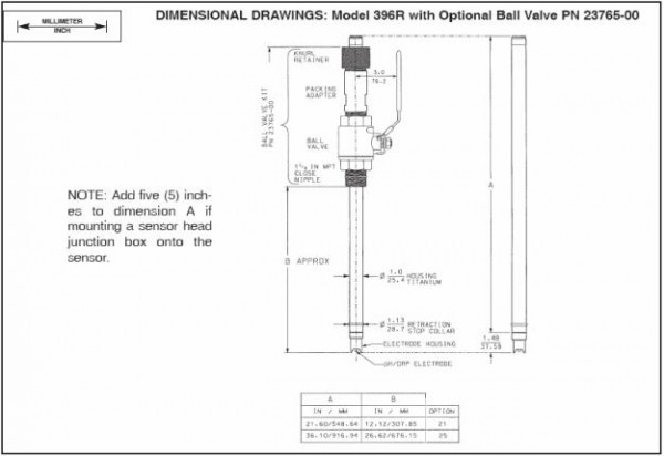 396R 傳感器本體是鈦材,帶獲得專利的聚丙烯參比電極液體接界、鈦接地極和球閥(后者要分別采購),適用于某些不能停產(chǎn)的流通式安裝需要。傳感器是鈦材套管的玻璃電極(pH) /鉑電極(ORP),測溫?zé)犭娮枋荘t100 或 3K Balco。 396R 傳感器不內(nèi)置前置放大器,配 15 英尺或者 9.5 英寸的電纜。如果分析儀或變送器內(nèi)沒有前置放大器,則即便傳感器的電纜為 15 英尺,也要另外采購內(nèi)置前置放大器的接線盒。此外,過程接頭和球閥附件也要另行采購。