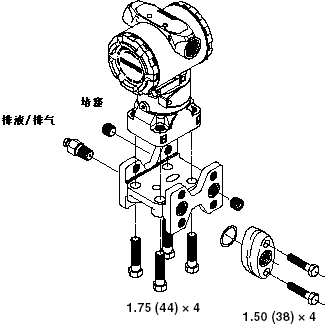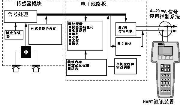 3051 型變送器主要部件為傳感器模塊和電子元件外殼。傳感器模塊包括充油傳感器系統(tǒng)(隔離膜、充油系統(tǒng)和傳感器)以及傳感器電子元件。傳感器電子元件安裝在傳感器模塊內(nèi)并包括一溫度傳感器(電阻式測試檢測器)、儲存模塊和電容/數(shù)字信號轉(zhuǎn)換器(C/D 轉(zhuǎn)換器)。來自傳感器模塊的電子信號被傳輸?shù)诫娮釉鈿ぶ械妮敵鲭娮釉k娮釉鈿ぐㄝ敵鲭娮泳€路板(微處理器、儲存模塊、數(shù)字/模擬信號轉(zhuǎn)換器或 D/A 轉(zhuǎn)換器)、本機零點及量程按鈕和端子塊。