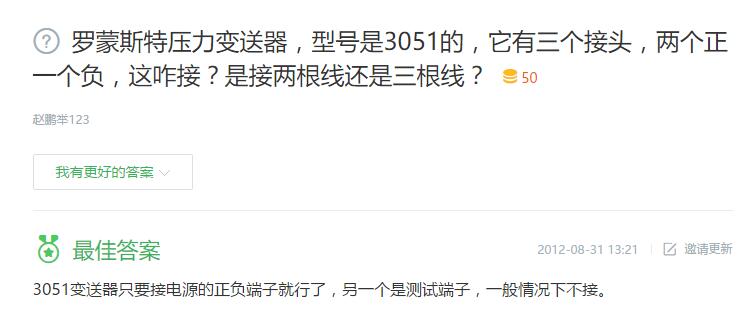 1、羅蒙斯特壓力變送器,型號是3051的,它有三個(gè)接頭,兩個(gè)正一個(gè)負(fù),這咋接?是接兩根線還是三根線?