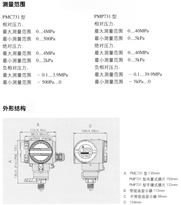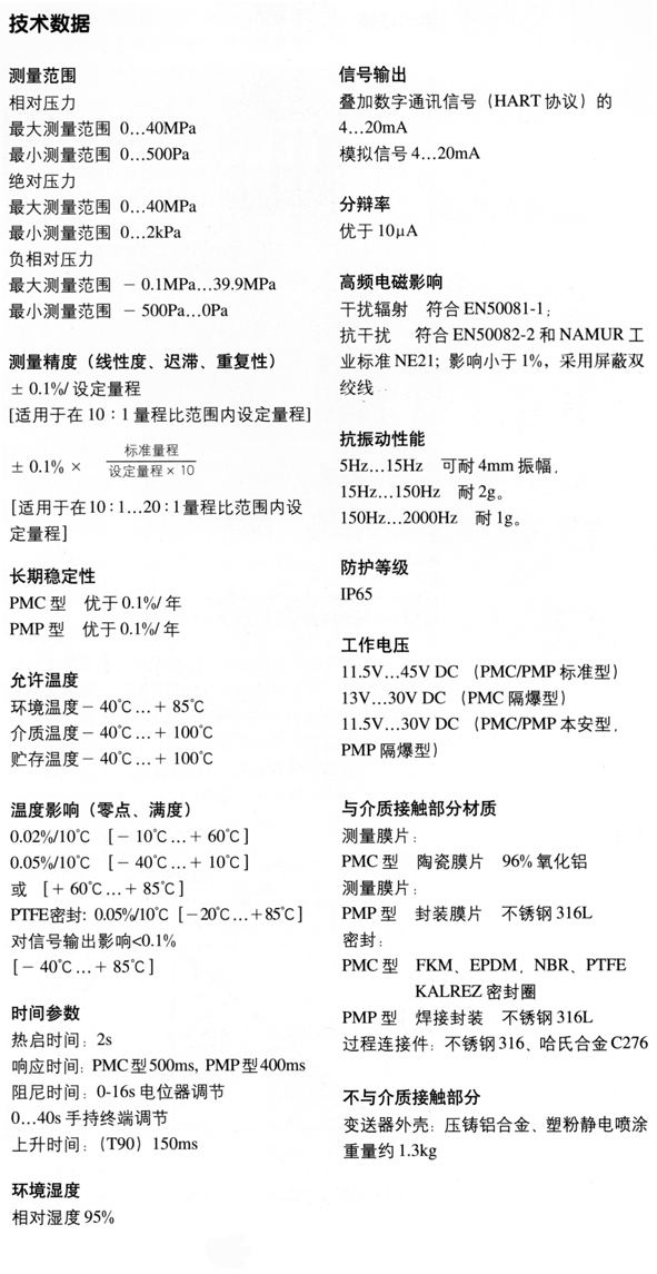 PMC/PMP731智能壓力變送器可精確測量所有化工及過程控制領(lǐng)域中氣體、蒸汽和液體的壓力,此傳感器可用于測量和液體的壓力,此傳感器可用于測量從5mbar至400mbar(0.075至6000psi)的表壓和絕壓。