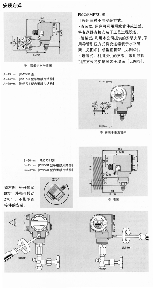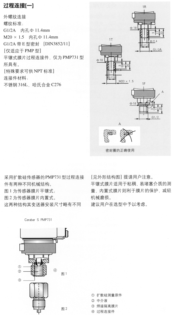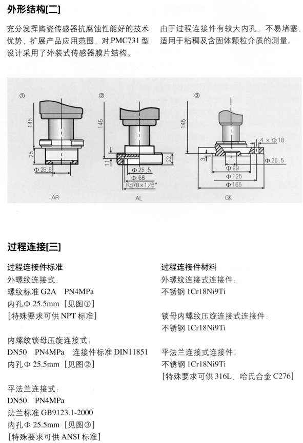 PMC/PMP731智能壓力變送器:壓阻效應(yīng)的壓力測量,采用擴(kuò)散硅測量元件,測量范圍可達(dá)400bar(6000psi).螺紋表面為齊平金屬膜片,適合于高粘度介質(zhì)。